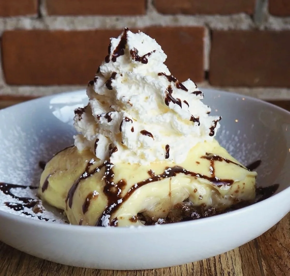 Diced cinnamon bun, banana, chocolate chips, topped with, whipped cream, and chocolate drizzle