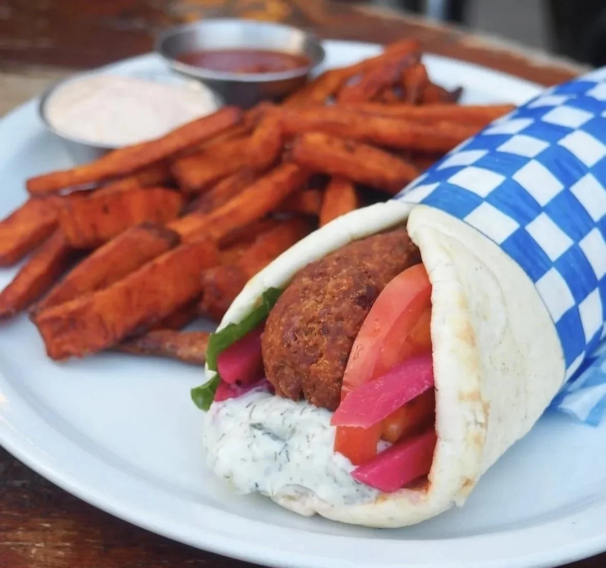 2 pcs fried falafel, romaine, tomato, pickled turnips, cucumber dill tzatziki, on a pita wrap